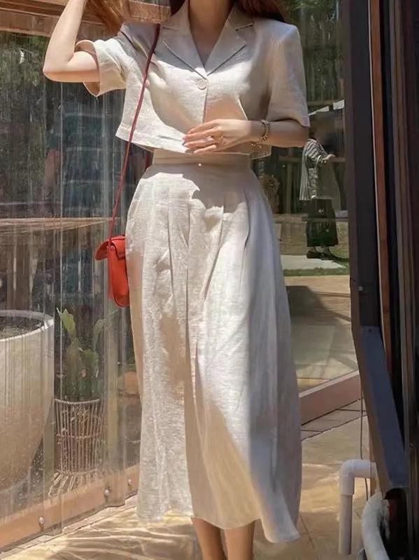 Loose Linen Short Shirt & A-line Skirt 2 Pieces Suit