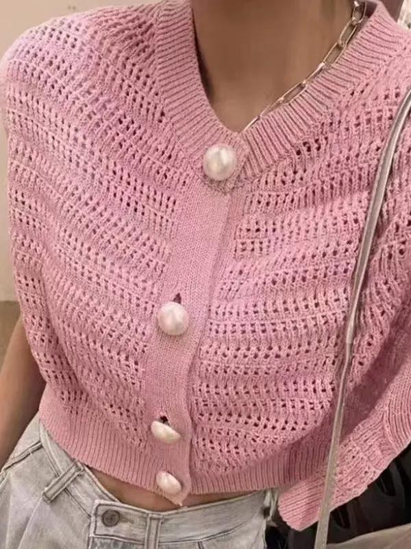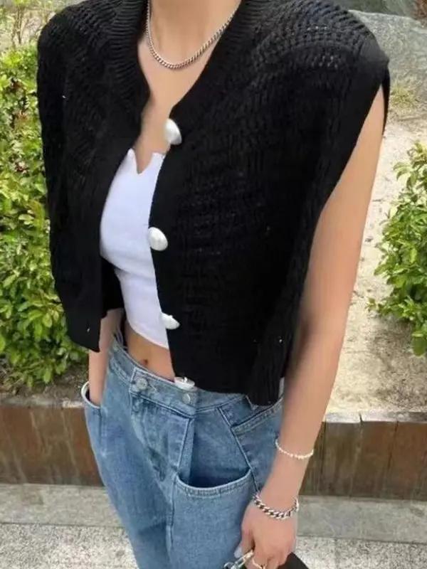 Pearl Button Hollow Jacquard Sleeveless Knitted Vest