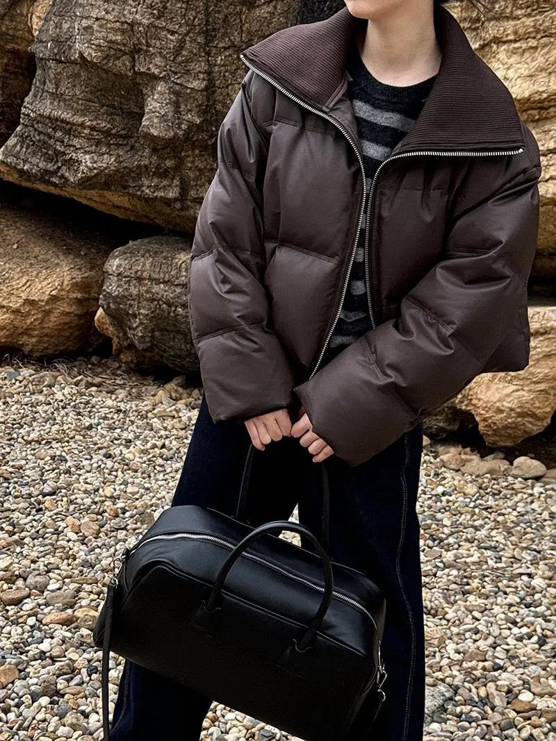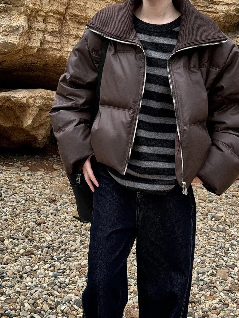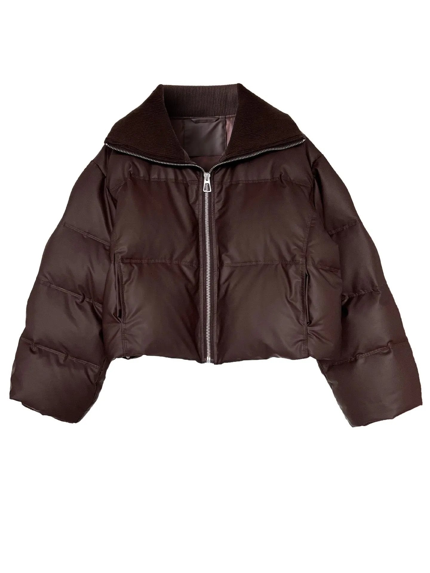 Stay warm and stylish with the Spliced PU Leather Down Jacket. Featuring a modern spliced design and durable PU leather exterior, this jacket offers lightweight insulation for comfort without bulk. Perfect for chilly days, it combines edgy fashion with practical warmth in one sleek piece.