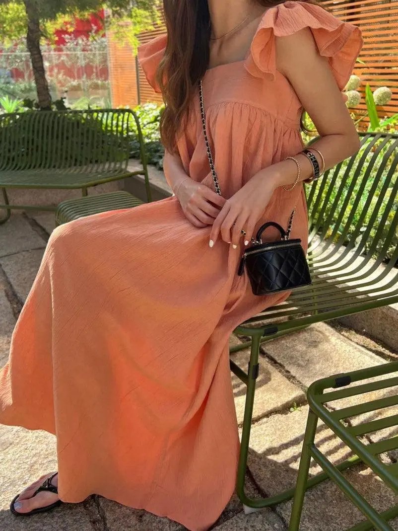 Square Neck and Fungus Trim Paneled Pleated Fly Sleeve Dress PAINEVIDA